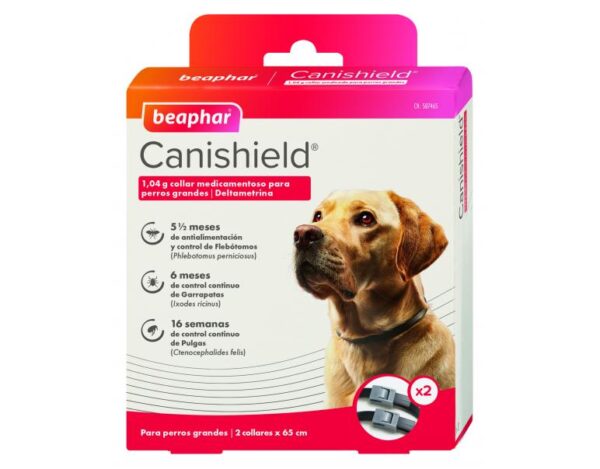 El collar antiparásitos para perros Canishiel de Beaphar es un producto de máxima calidad para evitar el contagio de parásitos como pulgas, garrapatas y mosquitos como el flebótomo trasnsmisor de la leishmaniosis.