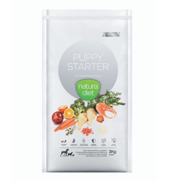 Natura Diet Puppy Starter pienso para destete de cachorros natural super premium completo y equilibrado. Para la alimentación de cachorros de cualquier tamaño o raza, de hasta 6 meses de edad, que requieren una dieta natural, nutritiva, saludable y biológicamente adaptada para un crecimiento óptimo.