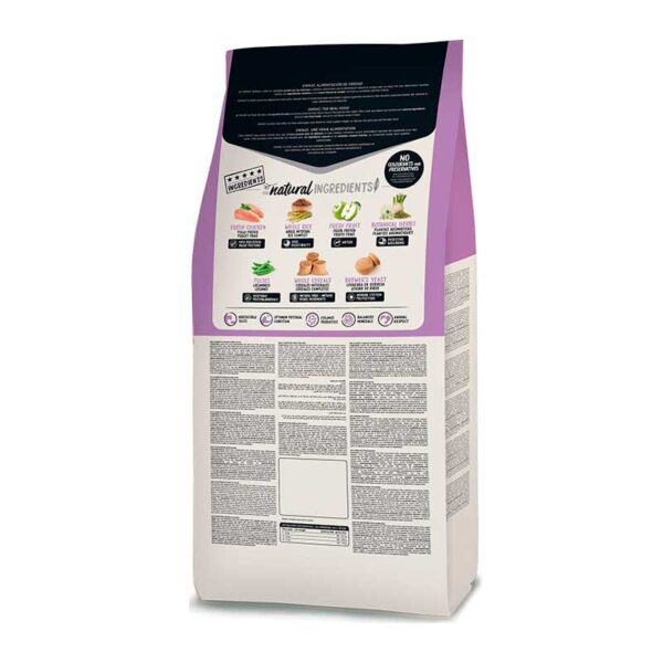 Carnes 36% (carnes deshidratadas 26%, pollo fresco* 10%), cebada integral* (10%), guisantes enteros* (9%), maíz integral* (9%), grasa de pollo, proteína de maíz, trigo integral* (7%), hidrolizado de salmón (5%), arroz integral* (2%), levadura de cerveza* (2%), proteína hidrolizada de pollo, manzana fresca* (1%), aceite de salmón, pulpa de remolacha, fructo y manano oligosacáridos, hierbas botánicas 0,02% (hinojo*, flor de manzanilla*, anís verde*), yucca schidigera. *Ingredientes naturales.