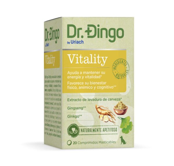 Suplemento natural Dr Dingo Vitality para perros para ayudar a mantener su energía, vitalidad y bienestar físico, mental y cognitivo.
