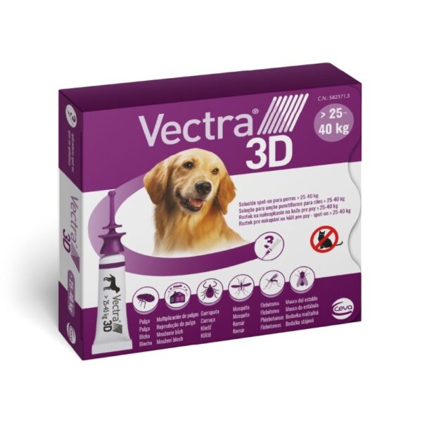 Las pipetas Vectra 3D ofrecen una protección eficaz y de amplio espectro contra los principales parásitos externos que afectan a los perros. Su fórmula única actúa de forma rápida y prolongada, eliminando y repeliendo pulgas, garrapatas, mosquitos, flebótomos (vectores de la leishmaniosis) y moscas del establo.